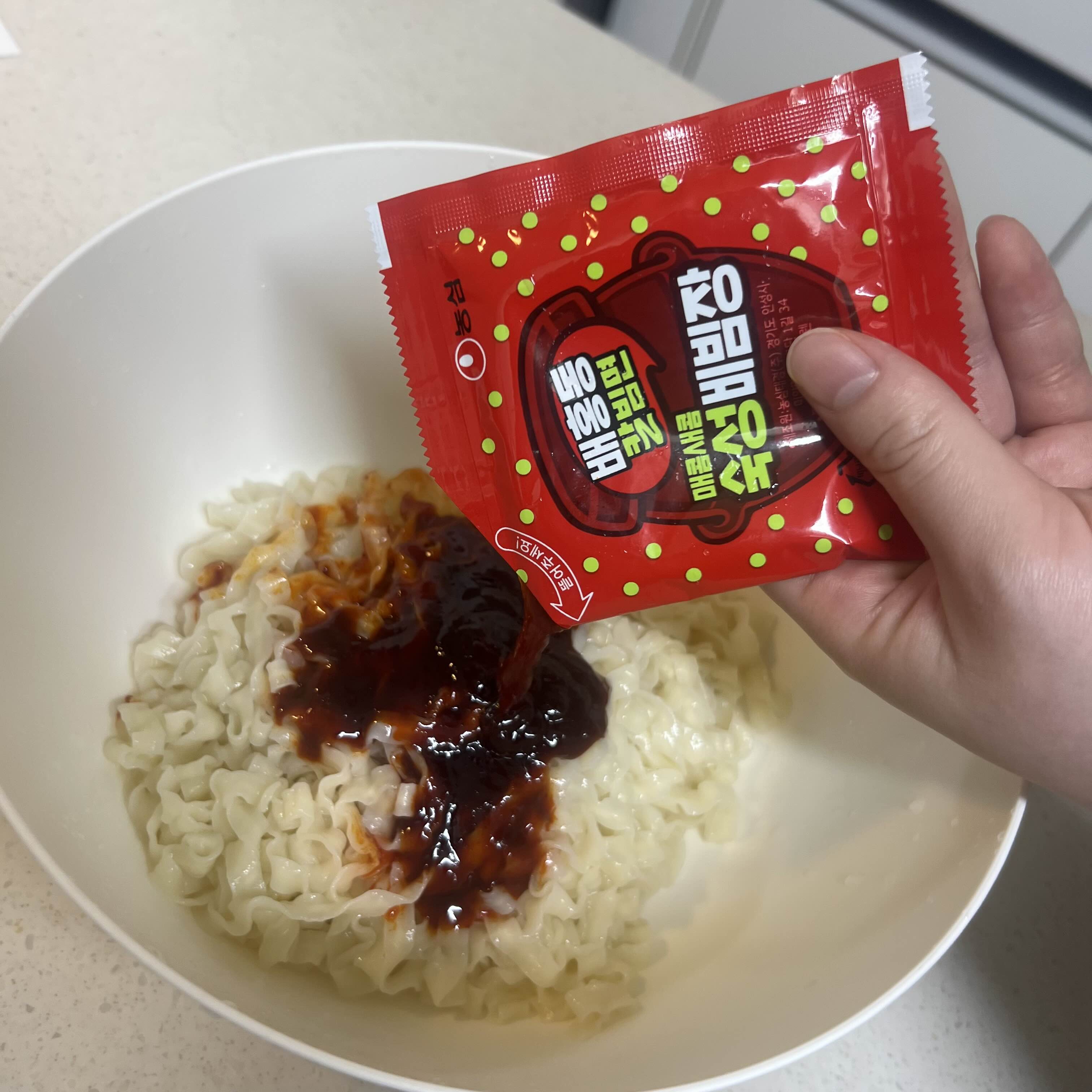 그릇에 면을 담고, 배홍동 전용 양념소스를 부어줍니다.